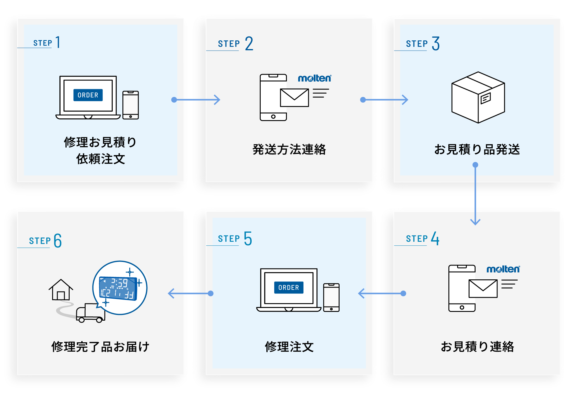 修理お見積りの注文後、モルテンより発送方法を含む確認メールと、発送いただくための梱包箱・送り状をお送りします。